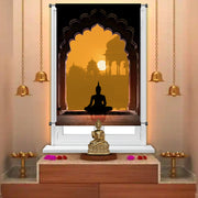 The Tranquil Buddha Meditation Blind captures a serene moment of sunrise meditation framed by a traditional Indian arch. With its warm saffron tones and peaceful composition, this design radiates spirituality and calm, perfect for creating a sacred ambiance in pooja rooms or serene corners of your home.