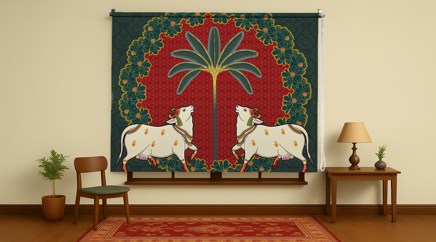 The Divine Cow Harmony Blind celebrates traditional Pichwai artistry with two sacred cows set in symmetrical reverence beneath a palm tree motif. Rich tones of green and red with golden highlights make this design an elegant expression of divinity, ideal for serene spiritual corners or regal ethnic interiors.