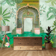 A royal arched doorway opens into a serene emerald pool adorned with lotus blooms and swans—an ode to timeless Indian elegance. This exquisite design blends heritage architecture with natural calm, perfect for luxurious interiors. Gracefully crafted by Lolliandomi.